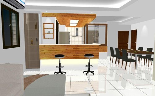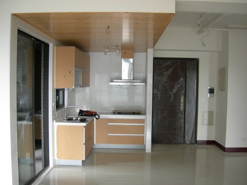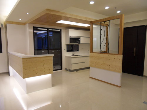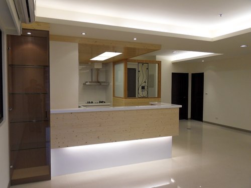 吧檯左側設置一茶色玻璃展示空間藉以連結原木色調延伸至客廳搭配現成家具比較現代感 , 吧台桌面以人造石材配置與下層烤漆顏色相同 , 讓原木色澤質感顯露無遺 , 廚房洗手槽側面須設置冰箱 , 阻礙進出陽台使用另一儲物櫃動線 , 將落地式推拉窗左右對調並且增加一輔助取手方便推拉門啟閉 , 玄關特別以L型設計連結廚房面使用一般俗稱白膜玻璃加以阻隔業主希望進門不要直視廚房的需求 , 正面則以細緻鍛造刻紋造型加上左右兩側完全透明的玻璃 , 讓開窗以後的風壓不至於有人回來時一開門造成大門不易開啟 , 也讓進門後視線上是非常開闊明亮 , 搭配燈光照度反射明亮給家產生一種溫暖歸屬感 .