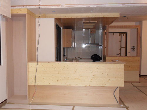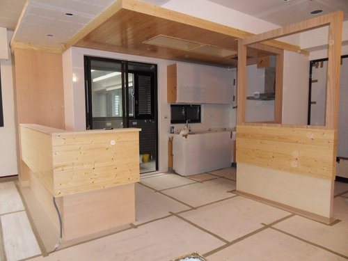 雖然施作範圍只有局部空間 , 但還是必須將整個原有的拋光石英磚以底層為中空板+上層為一分夾板鋪貼保護 , 防止施作過程細砂礫因過程磨擦產生表面難以處理的刮傷 , 依建商附設材質顏色嚴選相近且色調有些許落差的板料鋪貼製作 , 天花板面材一律使用一及防火建材(矽酸鈣板) , 天花板依現況運用手工機具直線切割挖開 , 補強其被破壞的結構頂端 , 將流明光源位置預留產生框架空間比例.